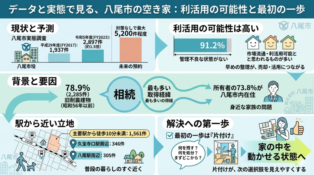 空き家が増えていると聞くと、不安に感じる方も多いと思います。 ただ、八尾市の資料を見ると、令和5年度に確認された空家等のうち91.2%は 「管理不良な状態がない」とされています。
