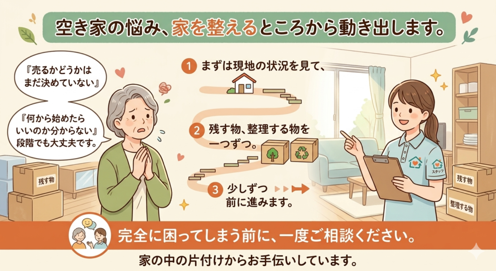 空き家の悩みは、不動産の問題に見えて、 実際には片付けのところで止まっていることが少なくありません。