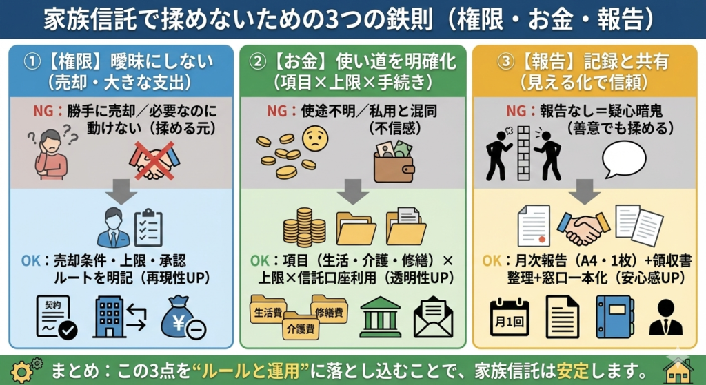 5. 家族信託の注意点(ここを曖昧にすると揉めやすい)